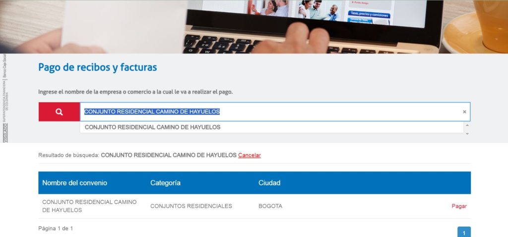Buscar el nombre de convenio: CONJUNTO RESIDENCIAL CAMINO DE HAYUELOS y podras ver el convenio, le das clic sobre el nombre de convenio: